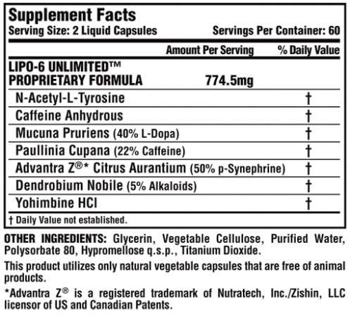 Кроме этого, в составе lipo 6 unlimited нашлось место и ряду других компонентов — Advantra Z, Dendrobium Nobile (5% алкалоидов), Citrus Aurantium (50% P-Synephrine) и прочим вспомогательным веществам.