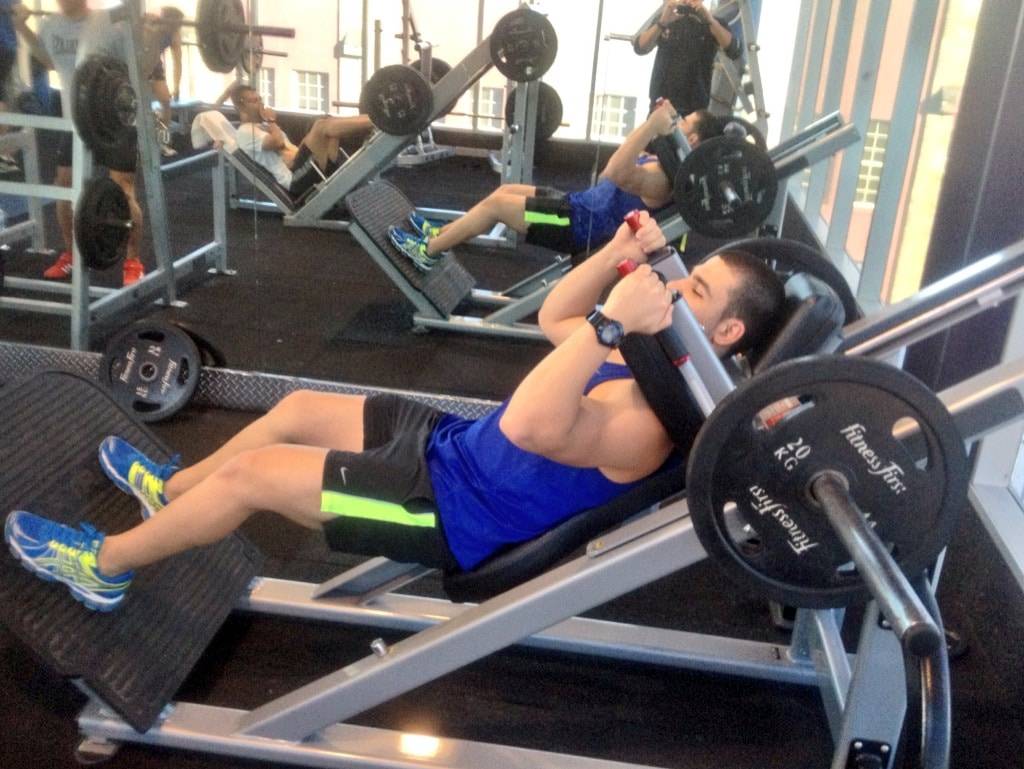 - Повесьте рабочий вес в Гакк тренажер, предварительно сделав мягкую разминку на разработку мышц и суставов.