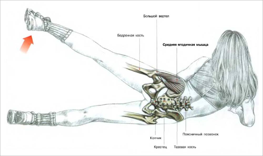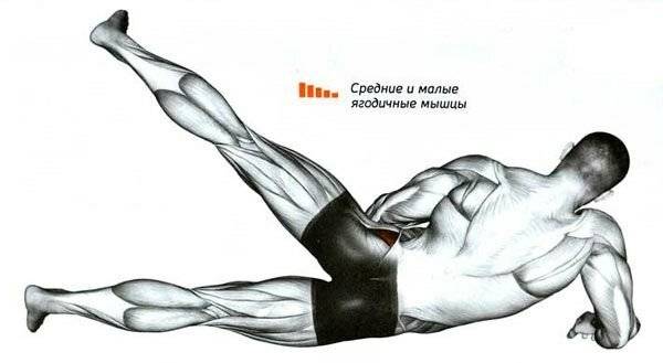 В классическом варианте работают средние и малые ягодичные мышцы.