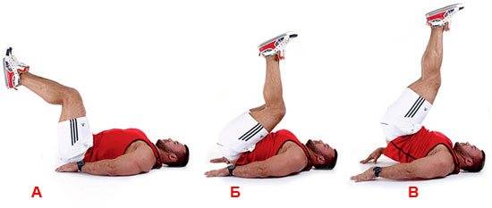 2) Поднятие вертикально поднятых ног — строго вверх с отрывом таза и нижнего участка поясницы, руки бёдрам не помогают, в верхней точке «грузится» верхний участок прямой мышцы пресса;