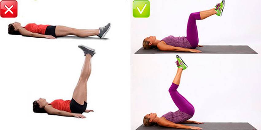 Когда вы прогибаете спину, начинает работать не брюшной пресс, а другие мышцы; кроме того, защемляются межпозвоночные диски поясницы. Цель этого упражнения не в том, чтобы поднимать ноги, а в том, чтобы поднимать прежде всего бедра.