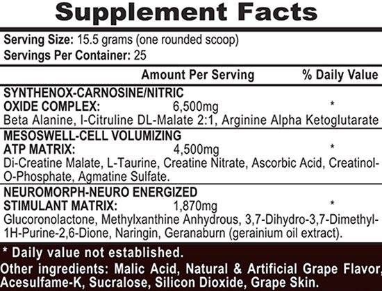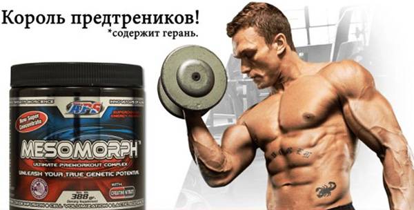 Добавка Мезоморф обеспечивает всплеск энергии и силы, а также повышает выносливость спортсмена. Его многие считают «королем предтреников»