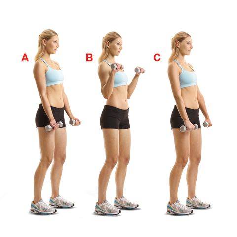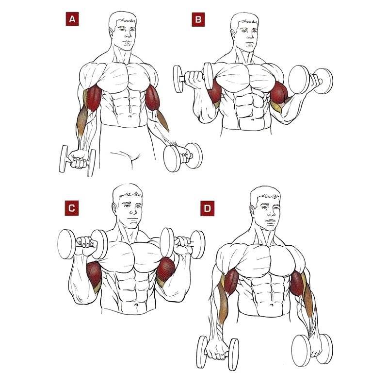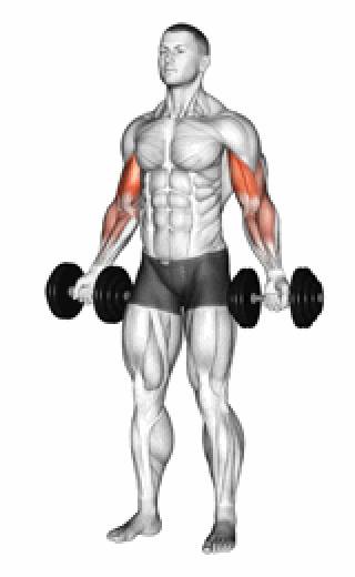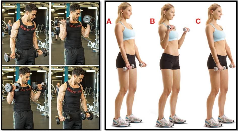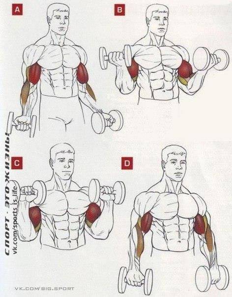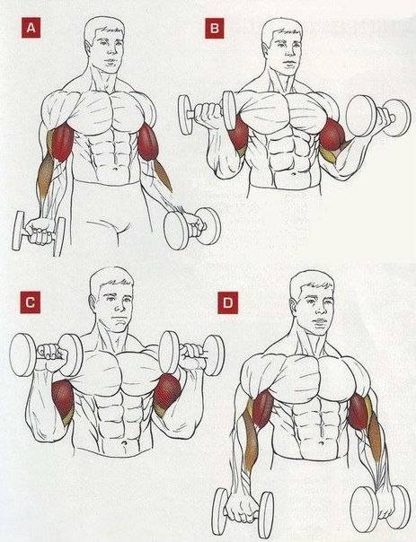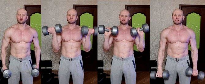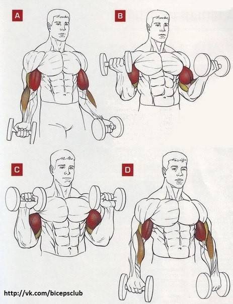 - Во время подъема гантелей работает бицепс, когда происходит разворот запястья;