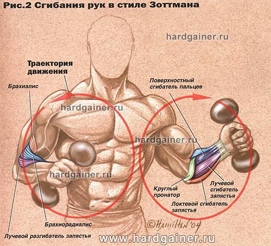 предназначены для тренировки бицепса, брахиалиса и мышц пред-плечья, что достигается с помощью супинации и пронации кисти. Упражнение это ред-кое, при-ме-ня-ют его не часто, поскольку оно преследует достаточно специфические за-да-чи, но это не говорит о том, что оно неэффективное, скорее всего, упражнение Вам по-нра-вит-ся. Сги-ба-ния Зоттмана можно применять для усиления хвата и улучшения ней-ро-мы-шеч-ной свя-зи, а так же в качестве способа прокачать бицепс и брахиалис. Слож-ная тех-ни-ка выполнения упражнения не позволяет использовать большие рабочие ве-са, хо-тя, сам Зотт-ман тре-ни-ро-вал-ся с гантелями по 50кг, но у Вас вряд ли получится пов-то-рить его ре-корд. Воспринимайте упражнение, как способ создания необычной наг-руз-ки и про-ра-бот-ки тех мы-шеч-ных волокон, которые обычно недорабатывают.