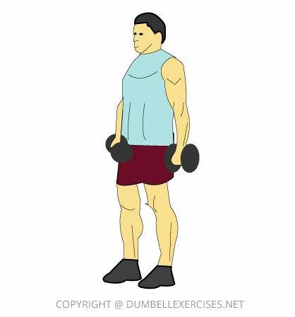 - Упражнение выполняется стоя. Ноги должны стоять на ширине плеч, гантели удерживаются в руках с прямыми локтевыми суставами. Спину следует держать прямо. Мышцы кора находятся в постоянном статическом напряжении. Ноги можно слегка согнуть в коленях для улучшения равновесия и устойчивости.