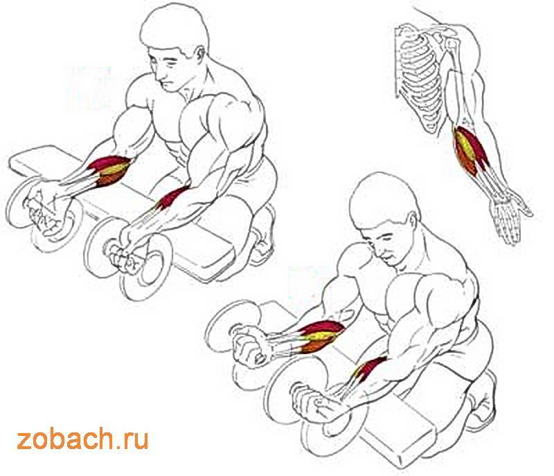 Сядьте на скамейку, предплечья опустите на нее, или на колени, чтобы кисти свободно висели ладонями вниз. Взяв штангу хватом кверху, поднимаете кисти, потом опускайте. Упражнение направлено на развитие разгибателей запястья.