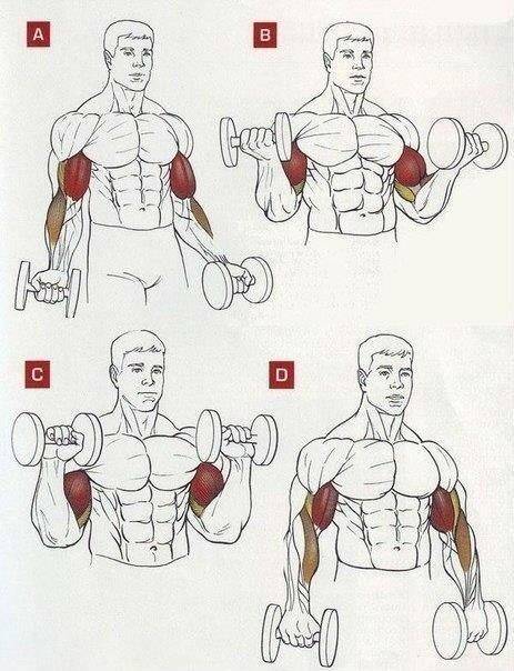 Задействует те же мышцы, что и предыдущем упражнении, однако выполняется с гантелями. По мере продвижения гантелей вверх нужно повернуть кисти ладонями вниз. Затем движение выполняется в обратном порядке, когда опускаете гантели.