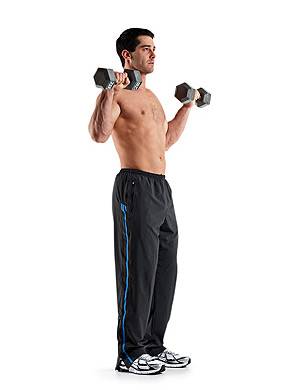 3. Держи плечи неподвижно. На выдохе выполни сгибание рук на бицепс, поворачивая запястья так, чтобы ладони оказались обращены кверху. Движение должно продолжаться до полного сокращения бицепсов, пока гантели не окажутся на уровне плеч.