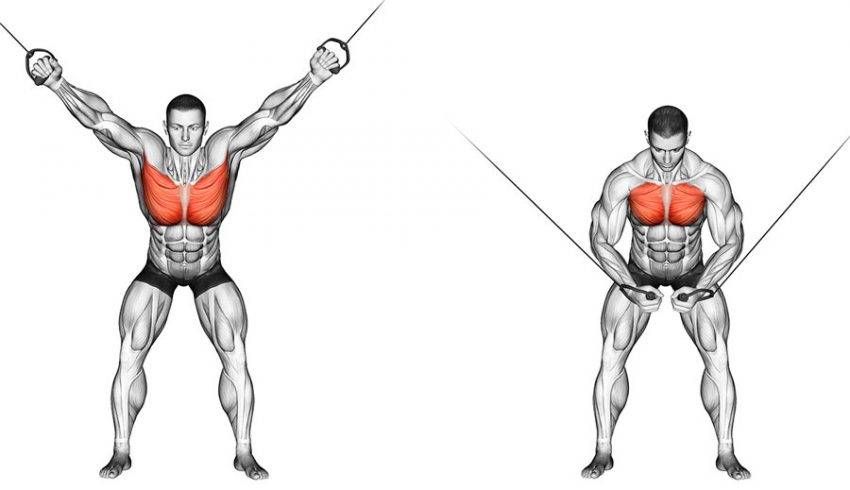 Упражнение представляет собой сведение рук перед собой, на уровне талии. Во время работы следует сознательно напрягать мышцы груди, и не расслаблять их как можно дольше, разводя руки в стороны по направлению к блочным механизмам.