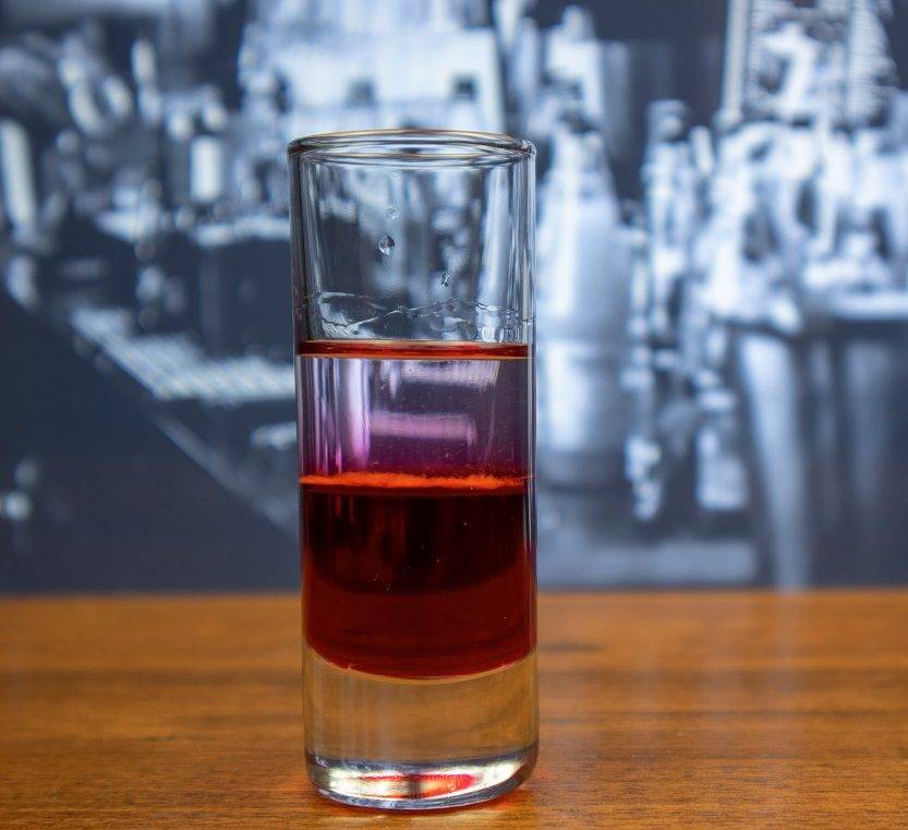 Hiroshima (Хиросима). Налить в рюмку слоями по 20 мл самбуки, Бейлиса и абсента, затем добавить несколько капель гренадина – на дне стопки как будто распустится атомный гриб.