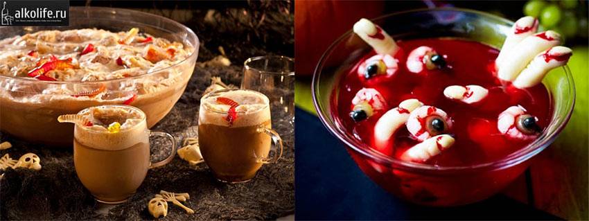 Могут быть самыми разнообразными – здесь целиком и полностью можно положиться на свою фантазию. Но самым главным для коктейлей в канун Дня всех святых является оформление. Желейные червяки, паучки, жевательные челюсти и многое другое – сгодится все «зловещее» и «пугающее». И не забудьте подать к вашим напиткам , чтобы напугать своих гостей до икоты:)