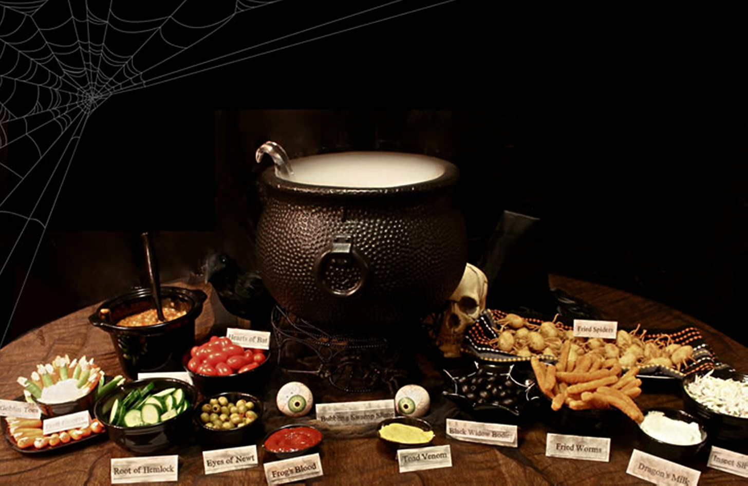 Рецепт зелья на Хэллоуин выгодно дополнят желейные вампирские зубы и пауки, а также потеки крови, стекающие с посуды для пунша.
