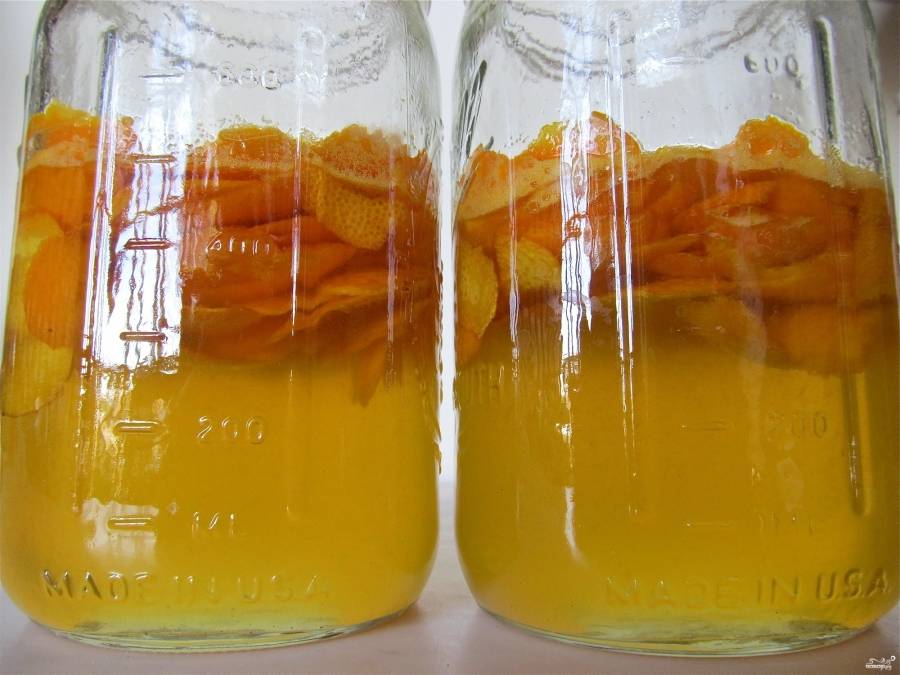 2. Снимаем с апельсинов цедру (ножом или теркой). Цедру убираем в стеклянную емкость, заливаем при этом спиртом, закрываем крышкой и оставляем так настаиваться в течение двух недель при комнатной температуре. Не забывайте дважды в день встряхивать емкость с настойкой.