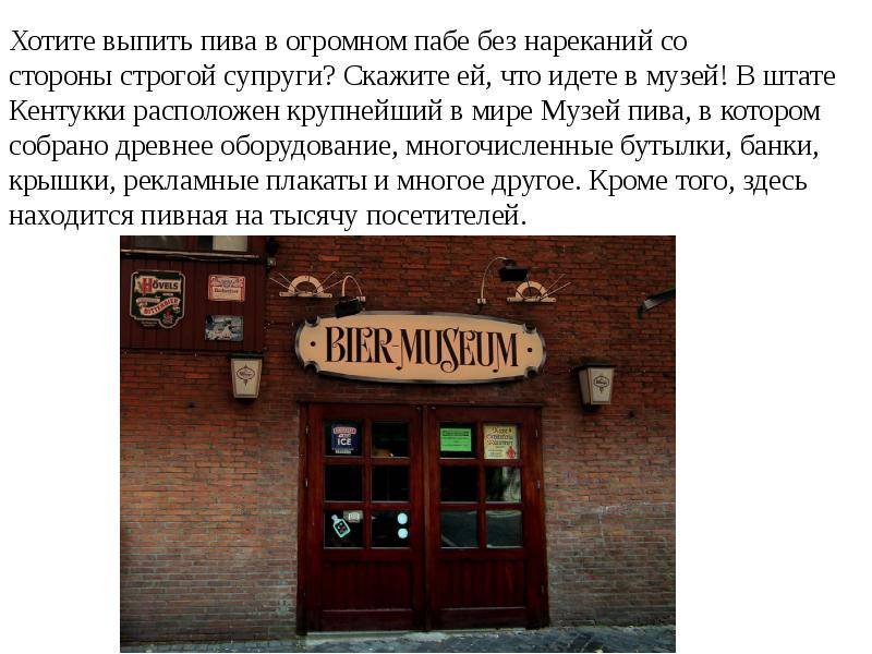 Самый большой музей, посвященный пенному напитку, находится в США в штате Кентукки. На территории этого объекта культуры помимо выставочной экспозиции работает настоящий бар, где может разместиться до тысячи посетителей одновременно.