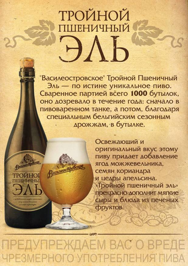Одним словом, эль — универсальный напиток, с которым приятно провести время в хорошей компании, избавиться от напряжения и получить истинное удовольствие. Его классический сладковато-горьковатый привкус поможет забыть о тревогах прошедшего дня и вкусить всю прелесть вечернего отдыха.