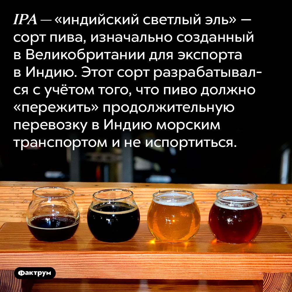 - Индийский Пейл-эль – можно отнести к предыдущей разновидности, но благодаря его популярности стоит всё же поговорить об этом сорте отдельно. Причём он по большей части английский, чем индийский, но благодаря своей истории, получил вот такое название. Скорее всего, это самый горький из существующих видов эля, и он же наиболее крепкий. В некоторых его сортах содержание алкоголя достигает 11% и более. А горький он, благодаря избыточному количеству хмеля в своём составе. В середине XIX века, во избежание порчи пива на длительных морских перевозках, при его приготовлении использовалось большое количество этого горьковатого растения.