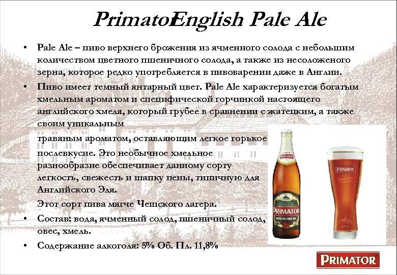 Классический напиток, который ассоциируется со старой доброй Англией. Чтобы приготовить традиционный Pale ale пивовары используют много хмеля и только светлый солод. Самый знаменитый варят в самом сердце Англии, в городке Бертон-апон-Трент. За пределами Британских островов его производят на заводах США и Канады. В Бельгии на такие слабоалкогольные напитки ставят маркировку Blonde Ale.