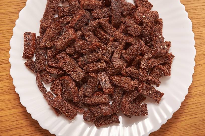 Шаг 6. Готовим сухари. Хлеб режем на небольшие кусочки и подсушиваем в духовке. Они должны быть твёрдыми, но не пережаренными.