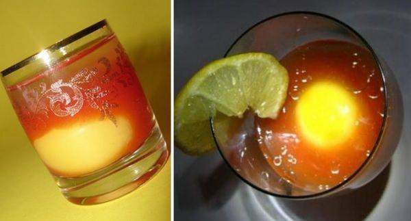 - Аккуратно разбить в стакан яйцо, чтобы желток не растекся. Добавить предварительно смешанные базовые ингредиенты (соки, соусы, приправы).