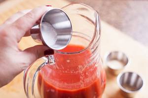 - В стакан заливаем томатный сок и разбавляем в нем соль и молотый черный перец.