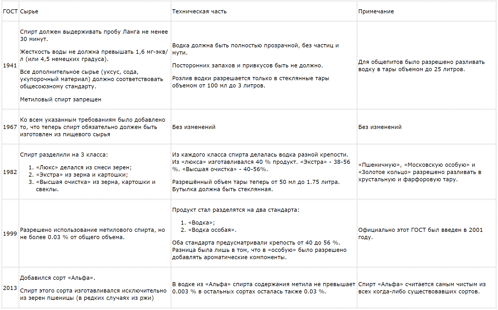 Чтобы четко ответить на вопрос, чем различается водка в СССр и в современной России, я собрал требования ГОСТов в одной таблице: