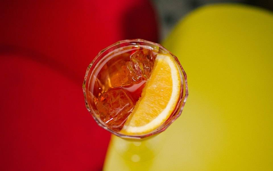 50 мл сладкого красного вермута; 50 мл. Кампари; 15-50 мл содовой; кубики льда; апельсин для украшения.