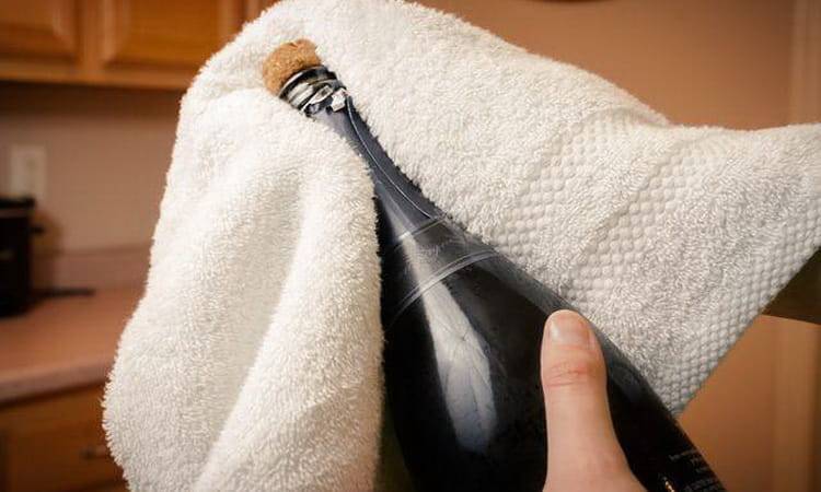 Охлажденную бутылку необходимо хорошо протереть от конденсата. Мокрую и скользкую емкость очень трудно удержать в руке, и в самый ответственный момент она может выскользнуть из рук. Чтобы избежать этого, необходимо воспользоваться полотенцем. Полотенце может послужить страховкой на случай, если пробка все же выстрелит. Направиться в другой конец помещения ей помешает тканевое полотенце, которое в этот момент будет расположено на поверхности горлышка бутылки.