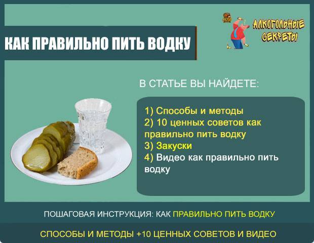 Далее водку закусывают, начиная с горячих сытных блюд и постепенно переходя к холодным. Запивать водку не рекомендуется или, в крайнем случае, брать напитки, не содержащие углекислого газа, который раздражает стенки желудка, приводя к быстрому опьянению. В этом плане безопасны соки, морсы и компоты. Знатоки рекомендуют между первой и второй рюмками делать трёхминутный перерыв. После третьей рюмки по возможности покинуть стол на 15-20 минут и погулять.