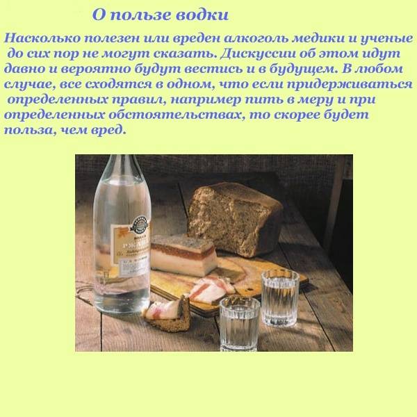 Медицина рассматривает водку как вредный для здоровья напиток. В ее составе не обнаружено никаких полезных для организма веществ. Но при правильном потреблении напиток может приносить и пользу – снять напряжение, стресс, помочь справиться с бессонницей. Кроме этого, водка обладает выраженным обезболивающим действием. В древности ее использовали в качестве средства для проведения наркоза, обезболивания при небольших операциях. Сегодня водка не используется в медицине в качестве анальгезирующего средства, так как это нецелесообразно. Фармацевтическая промышленность предлагает в широком ассортименте сильнодействующие обезболивающие препараты, которые имеют минимальное количество побочных эффектов.