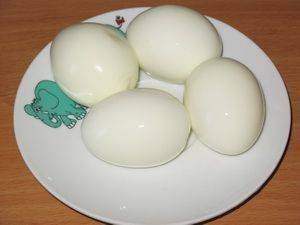 Яйца нужно отварить в соленой воде (это займет 10-15 мин), далее их опускаем в холодную воду и держим 5 минут, затем их чистим от скорлупы и режем пополам. Желкти натираем на мелкой терке, выкладываем на сырный слой и опять — сетка из майонеза. Сверху — тертые яичные белки с майонезом. Это последний салата.