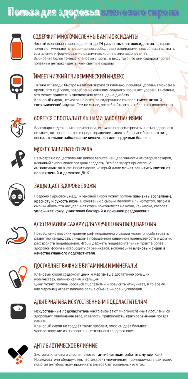 Эксперты утверждают, что данный продукт аналогичен по своим полезным свойствам меду, и даже полезнее, ведь кленовый сироп не такой сладкий, как мед, что наводит на вывод, что сахара в нем значительно меньше.
