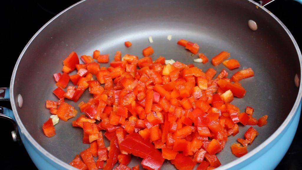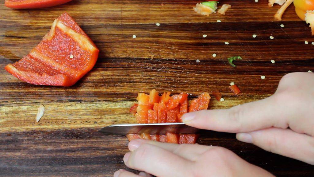 Болгарский перец разрезаю на две половинки, удаляю семена и мембраны. Режу овощи маленькими кубиками (для этого сначала нарезаю тонкими полосками, затем разрезаю их вдоль). Так же обрабатываю помидоры.