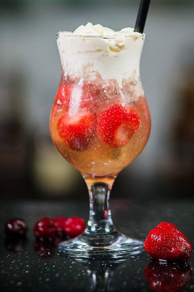2. «Россини» – другое название «шампанское с клубникой». В коктейль добавляют ингредиенты: 120 мл шампанского, 75 г клубники, 2-3 капли лимонного сока, сахар. Взбиваем сахар с клубникой с помощью блендера и добавляем лимонный сок. Если не хватает сладости, добавляем ещё сахар и взбиваем смесь. Ставим смесь в холодильник на 1 час. Смешиваем в шейкере треть пюре и две трети шампанского. Переливаем смесь через ситечко и убираем осадок.