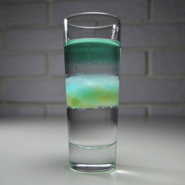3. После этого нужно капнуть ликера «Блю Кюрасао», желательно посередине рюмки. Затем немного подождать, чтобы это все растеклось и создало имитацию щупальцев медузы.