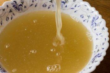 - По окончании мешочек с мякотью необходимо достать, остудить и хорошенько отжать. Полученный продукт нужно добавить в кастрюлю, а выжимки — выбросить.