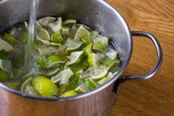 Утром добавляем к лаймам в сахаре 600 г воды. Ставим на плиту, доводим до полного растворения сахара и кипятим примерно 7 минут.
