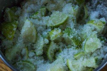 Тщательно моем лайм и режем на небольшие кусочки, посыпаем солью и оставляем на час. По прошествии 60 минут фрукты засыпаем половиной сахара и оставляем на 12 часов.