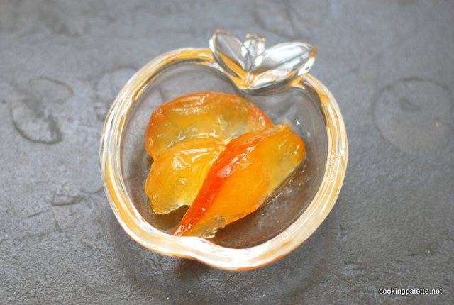 В кастрюле растопить сахар с водой. Опустить в сироп (или полусироп) кусочки яблок, довести до кипения и варить примерно 30 минут, аккуратно изредка помешивая и поливая яблоки получившимся сиропом. Яблоки должны стать полупрозрачными. Выключить огонь. Дать яблокам постоять примерно 1 час (можно дольше).