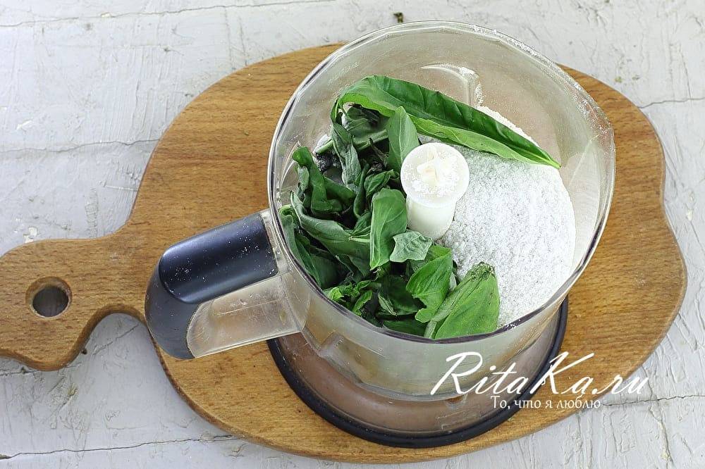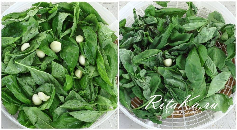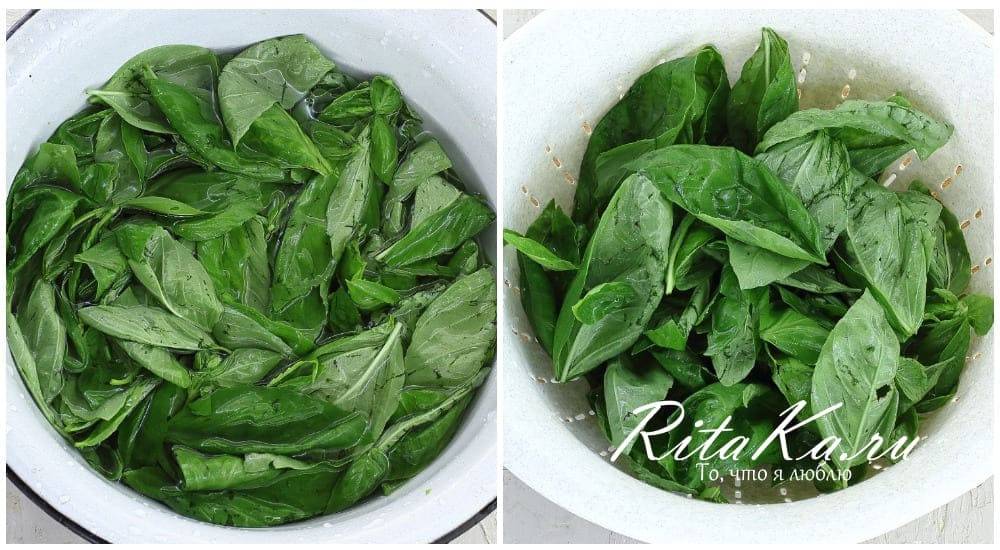 Лучше всего для приготовления данной заготовки подойдет лимонный базилик. Он очень ароматный и многим нравится. Оборвите качественные листья базилика и опустите в миску с холодной водой. Перемешайте. Оставьте на 15-20 минут, чтобы вся грязь опустилась на дно.