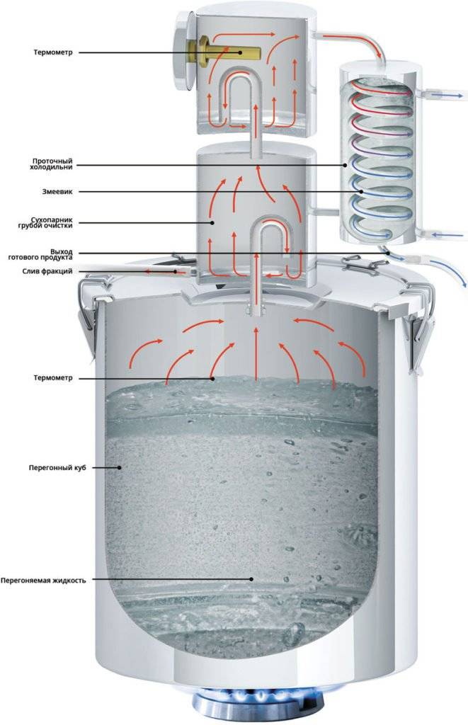 При нагревании браги? спирт начинает испаряться и уходить по трубке вверх. Далее он охлаждается, конденсируется в жидкость и стекает в подставленную ёмкость. Однако со спиртом испаряются и вредные примеси (сивушные масла и т.д.). Для очистки самогона в конструкцию дистилляторов добавляются сухопарники (дефлегматоры) и укрепляющие колонны (царги).