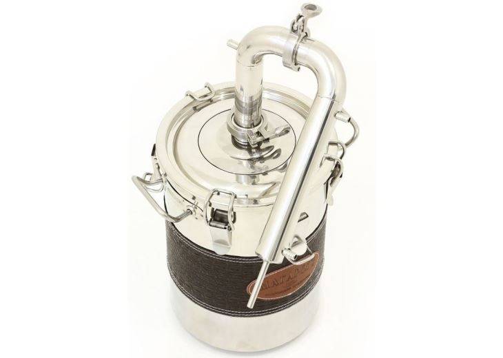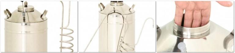 Перегонный куб комплектуется царгой диаметром 38 мм, что исключает ее закупоривание продуктами брожения, например, частицами фруктов или трав, и устраняет угрозу повышения давления в кубе до критических показателей. Крышка емкости, на которой монтируются сухопарники, плотно прижимается защелками. Для герметизации используется силиконовая кольцевая прокладка, входящая в комплект.