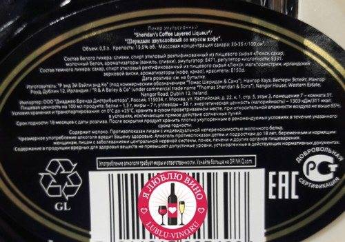 Начнем с того, что в этой бутылке два различных напитка: белый и темный, которые разделены стеклянной перегородкой и имеют отдельный «выход», так сказать. Состав белого: сливки, спирт «Люкс», сахар, молочный белок, ароматизаторы (ваниль, сливки), эмульгаторы: Е471, регулятор кислотности Е331. То есть белый – это сливочный liqueur, по сути. А вот состав черного: сахар, спирт «Люкс», мальтодекстрин, ирландский зерновой виски, ароматизаторы (кофе и какао), краситель Е150d. Вот это уже кофейная часть. Крепость у кофейного двухслойного ликера Шериданс (Sheridan’s) 15,5 градусов, то есть общее содержание спирта (алкоголя) тут 15,5 % (процентов). А сахара аж 300-350 грамм на литр. То есть около трети всего объема. Представляете, насколько сладко! Но давайте пробовать.