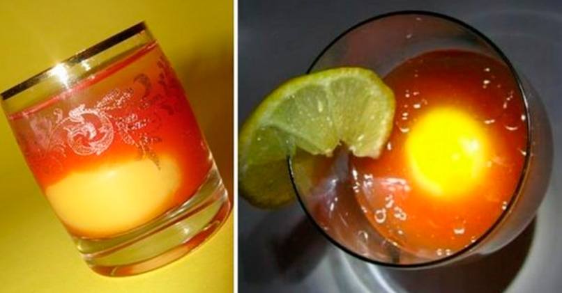 Отличный вариант для тех, кому нужно быстро восстановиться после вчерашнего застолья. Яйцо аккуратно разбивается на дно стакана, затем вливается томатный сок со специями и тихонечко по ножу вводится водка.