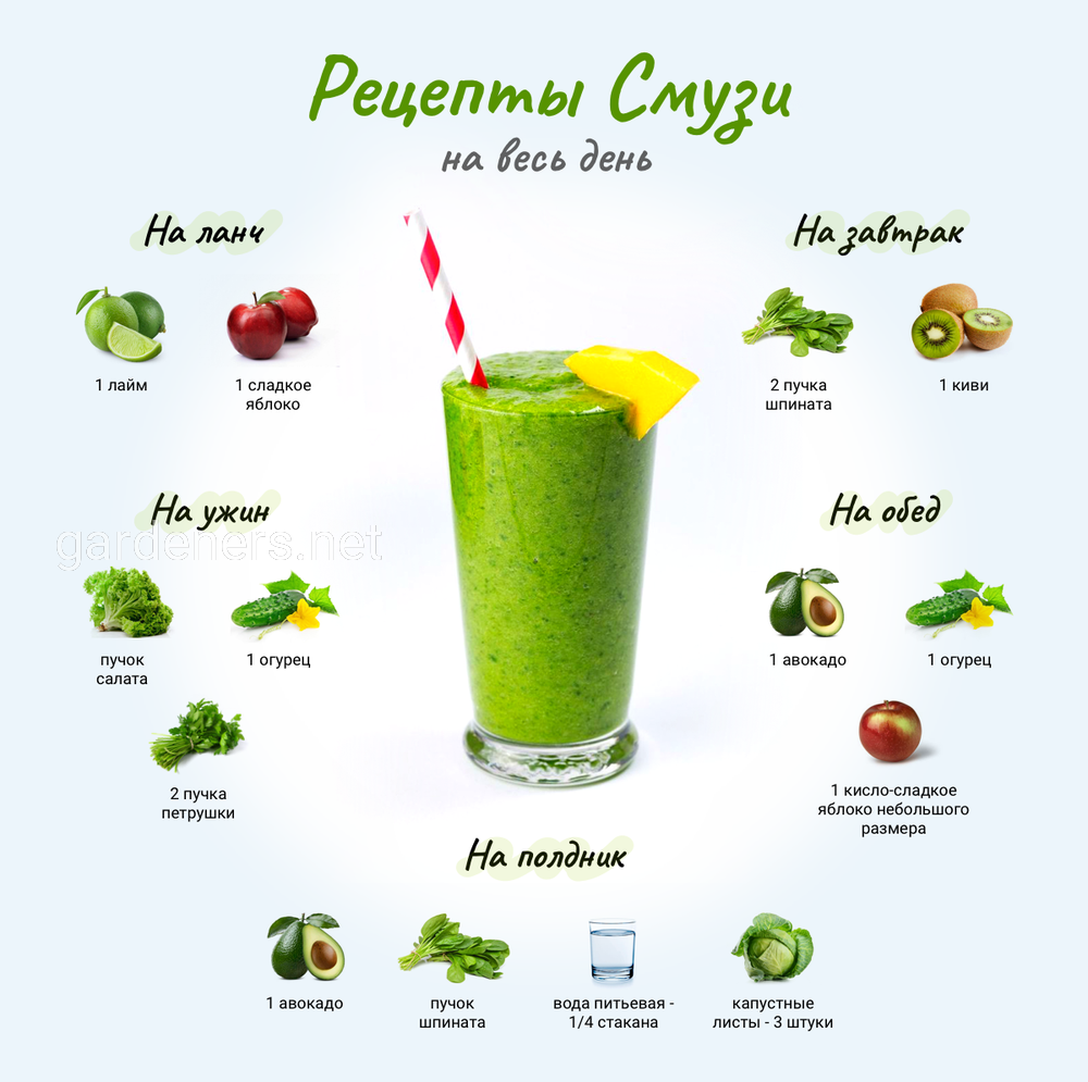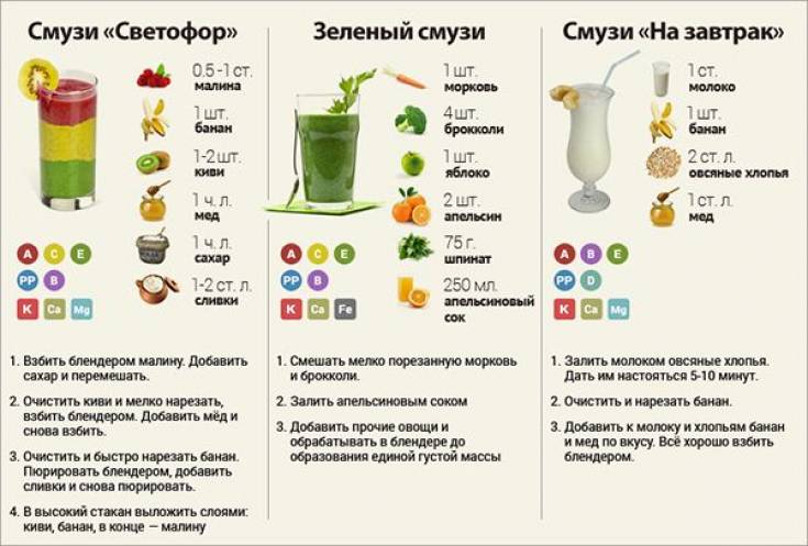 • В основу должны входить яблоки, сливы, киви, различные ягоды (можно замороженные), овощи (кроме кукурузы и картофеля). Их должно быть больше, чем жидких компонентов (сок, молочные продукты, вода).