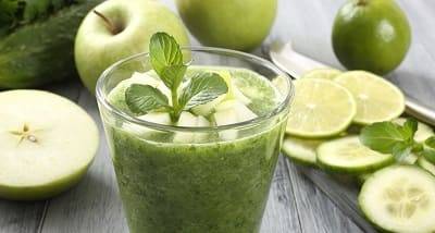 Приготовление: Очистите огурец от кожуры. Нарежьте овощ кольцами и положите в чашу блендера. Добавьте несколько листьев мяты, лаймовый сок и мед. Включите кухонный прибор на пару минут. Должна получиться однородная смесь. Полученный напиток разлейте по бокалам. Необходимо выпить жидкость сразу, поскольку через время полезные вещества начинают распадаться.