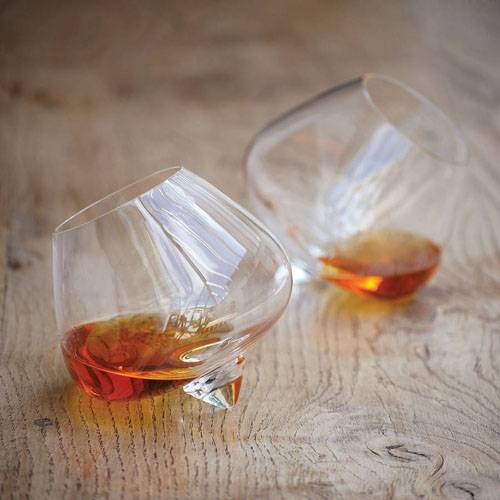 Wobble glass. «Воббл» – это тот же снифтер, но без ножки, а с остроконечным шипом снизу. Стоять такие бокалы не могут, только лежать, грациозно перекатываясь на манер неваляшки. Вращаясь вокруг своей оси, «воббл» перемешивает напиток, что помогает аромату раскрыться сполна.