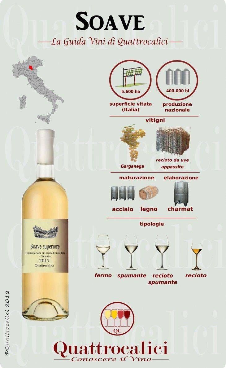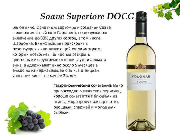 Вина «Соаве» категории DOC могут быть игристыми и тихими, но исключительно сухими. В 2001 году здесь же появилось новое название Soave Superiore, которое присваивается напиткам, произведённым из особо качественного винограда. «Супериоре» выдерживают не менее полугода, а если дело касается категории Riserva, срок продлевается до двух лет.
