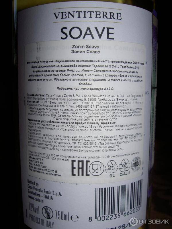 • Zeni Soave Classico DOC. Алкоголь ярко-желтого окраса с выразительной нотой белых цветов в запахе. Вкус строится на цитрусовых и минеральных оттенках.