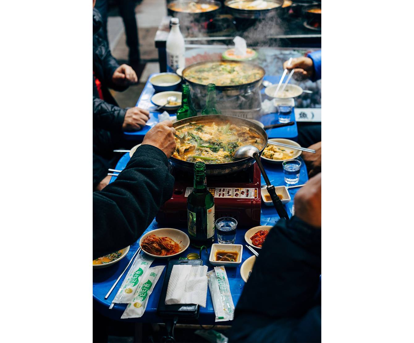Чтобы выпить приличное и доступное соджу, отправляйтесь в палатку с уличной едой (pojangmacha). На закуску к соджу в зеленой бутылке купите паджеон (pajeon) — блинчик с морепродуктами или токпокки (tteok-bokki) — рисовые колбаски в остром соусе. Такие палатки есть в любом районе Сеула, даже в шикарном Каннамгу (между 11-м и 12-м выходами из метро). Кстати, Каннамгу — это знаменитый район из песни Gangnam Style.