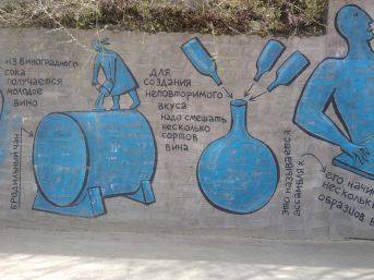 Стены вокруг дома старого хозяйства в «Абрау-Дюрсо» расписаны стилизованными граффити, повествующими об истории создания завода и технологии изготовления шампанского.